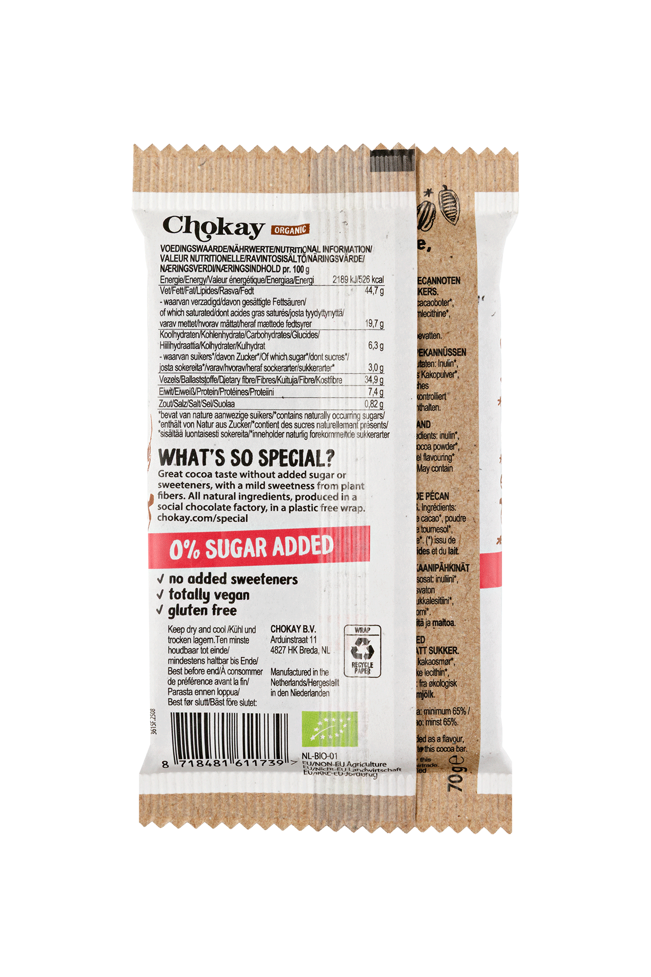 Ingredienser: mørk chokolade 79% (kostfibre: inulin*, kakaomasse*, kakaosmør*, skummet kakaopulver*, solsikkelecithin*, naturlig vaniljearoma*), pecannød* 20%, havsalt, naturlig karamelaroma*.