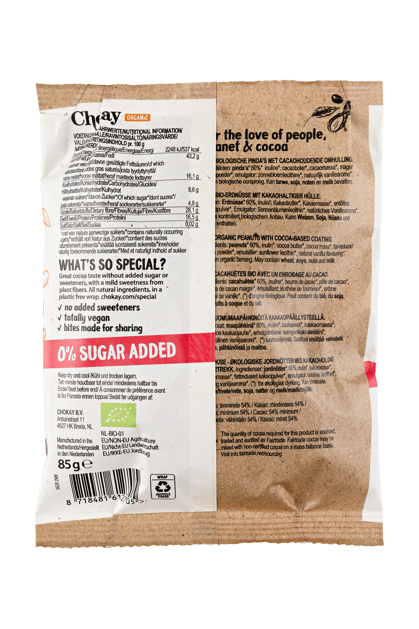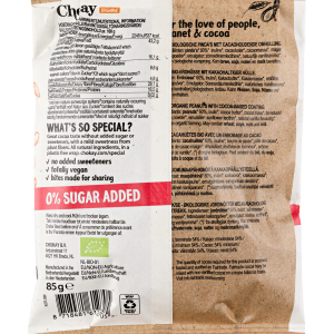 Zutaten: Erdnuss* 60%, Zartbitterschokolade 40% (Ballaststoffe: Inulin*, Kakaobutter*, Kakaomasse*, entrahmtes Kakaopulver*, Sonnenblumenlecithin*, natürliches Vanillearoma*).