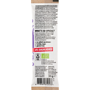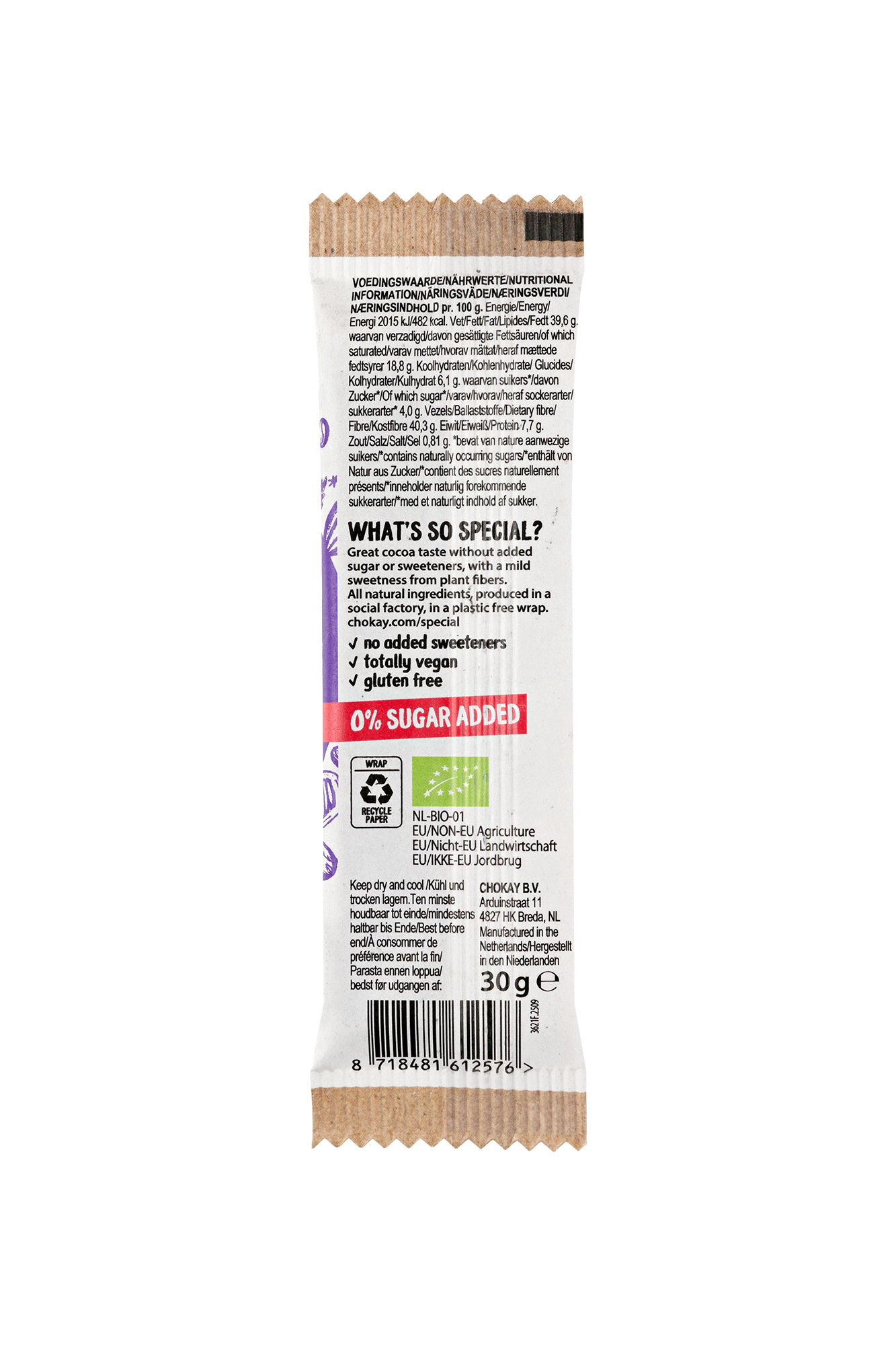 Ingredienser: mörk choklad 79% (kostfiber: inulin*, kakaomassa*, kakaosmör*, skummat kakaopulver*, solroslecitin*, naturlig vaniljsmak*), mandel* 20%, havssalt 1%.